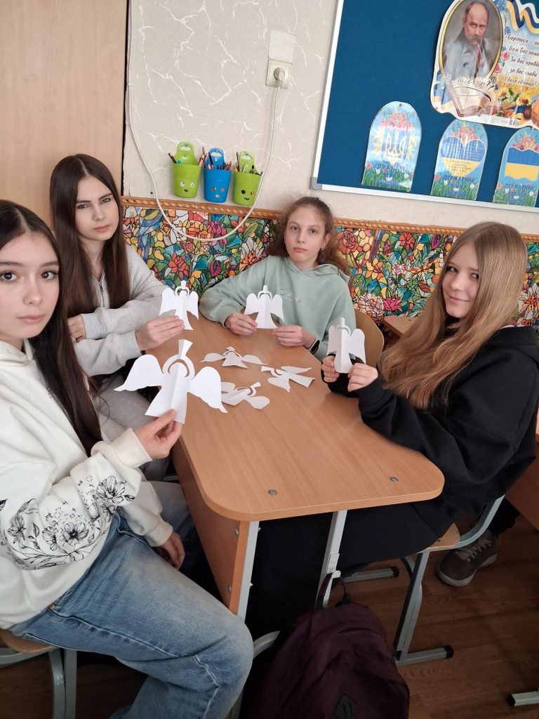 Особливо зворушливим стало виготовлення «янголів пам’яті» — символів чистоти й жертовності. Кожен паперовий янгол став тихою молитвою за душі полеглих Героїв. Ці янголи, як нагадування про те, що світло завжди перемагає темряву.